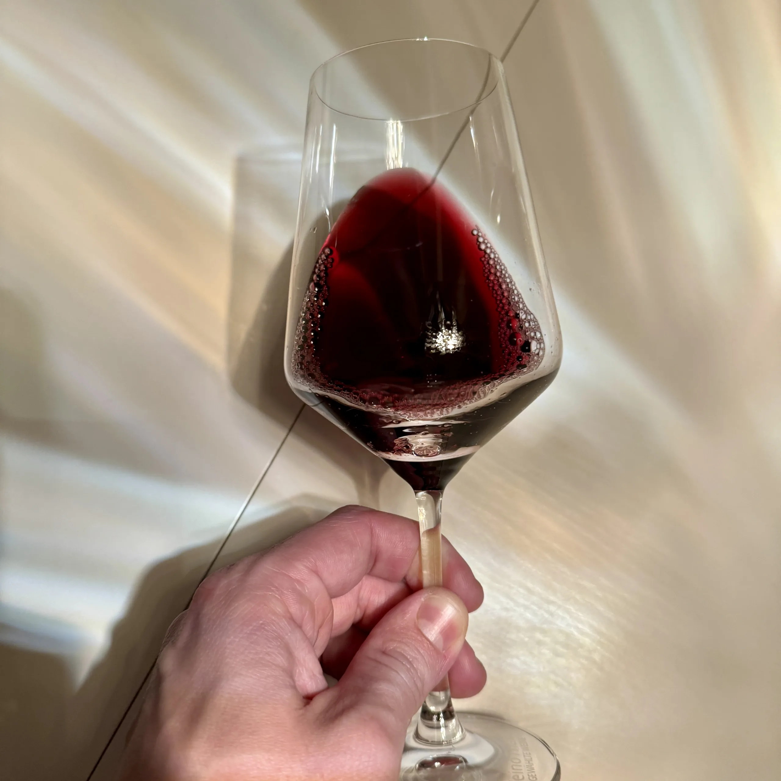 The wine showcases a stunning, transparent blackcurrant red hue, complemented by a rich, deep black core.